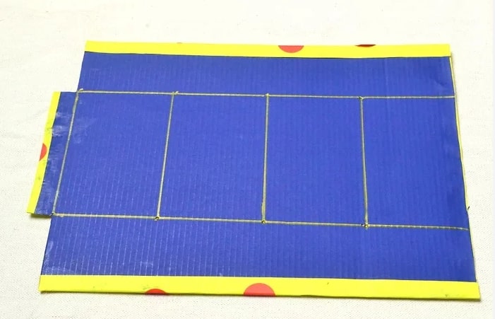 Bước 1: Bạn bỏ qua phần nắp gấp hộp, sau đó chia chiều dài miếng bìa thành 4 phần đều nhau và kẻ thành những hình chữ nhật nhỏ như hình. Đây chính là 4 cạnh của hộp carton nhỏ đấy. Phần trên và phần dưới sẽ tạo thành nắp và đáy hộp.