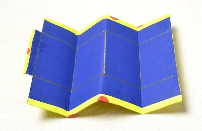 Bước 2: Tiến hành gấp bìa carton với 3 nếp gấp tại các đường kẻ như hình. Lưu ý vết gấp lồi và vết gấp lõm để dễ tạo thành hộp ở bước sau nhé. Nếu bạn chỉ dùng tay gấp theo đường kẻ bình thường, rất dễ không vào nếp, nếp gấp bị nham nhở. Một mẹo cực đơn giản dành cho bạn, hãy dùng 1 chiếc bút bi hết mực kẻ theo đường gấp với thước kẻ nhé. Sau đó bạn chỉ cần gập nhẹ, nếp gấp cực đẹp.